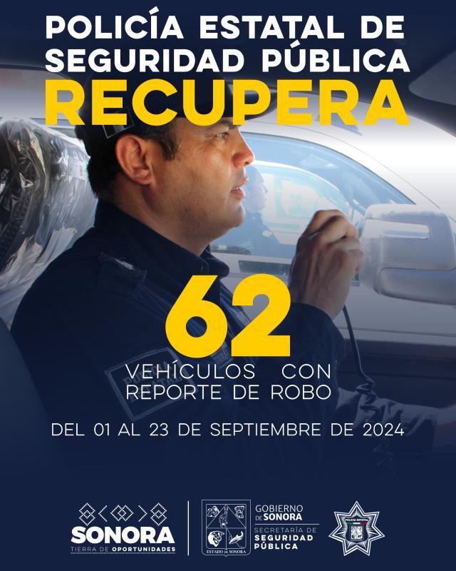La Secretaría de Seguridad Pública (SSP) en Sonora, a través de la Policía Estatal de Seguridad Pública, recuperó durante septiembre 62 vehículos con reporte de robo, en atención a las denuncias ciudadanas.