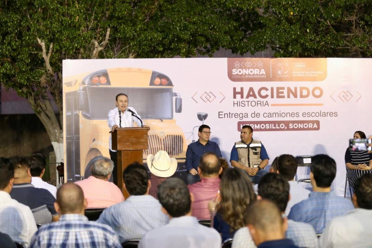 Como parte de los compromisos cumplidos con los municipios, el gobernador de Sonora, Alfonso Durazo Montaño, hizo la entrega de ocho camiones y dos camionetas escolares tipo tránsit para facilitar el traslado de los estudiantes a los planteles educativos, con una inversión total de 8 millones 21 mil 400 pesos, en beneficio de nueve municipios.