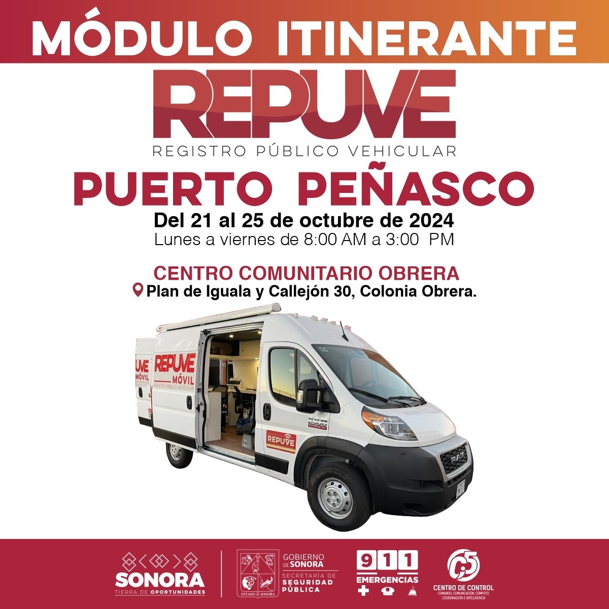 El módulo itinerante del Registro Público Vehicular (Repuve) inició este lunes 21 de octubre con el recorrido por municipios para atender a la ciudadanía interesada en realizar el trámite de regularización de autos usados de procedencia extranjera informó, la Secretaría de Seguridad Pública (SSP) en Sonora.