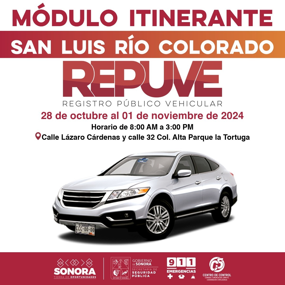 En atención a los habitantes de San Luis Río Colorado interesados en la regularización de autos usados de procedencia extranjera, el Gobierno de Sonora instaló en el municipio el módulo itinerante del Registro Público Vehicular (Repuve) dependiente de la Secretaría de Seguridad Pública (SSP). Del 28 de octubre al primero de noviembre, personal del Repuve facilitará el servicio a la ciudadanía en la unidad móvil ubicada en calle Lázaro Cárdenas y calle 32, en la colonia Alta Parque La Tortuga. El Repuve itinerante estará disponible para atención en un horario de 8:00 a 15:00 horas, con previa cita, a través del portal oficial www.regularizaauto.sspc.gob.mx. El Gobierno del Estado, a la fecha ha regularizado un total de 200 mil 41 vehículos, beneficiando con certeza jurídica de propiedad a familias sonorenses. |