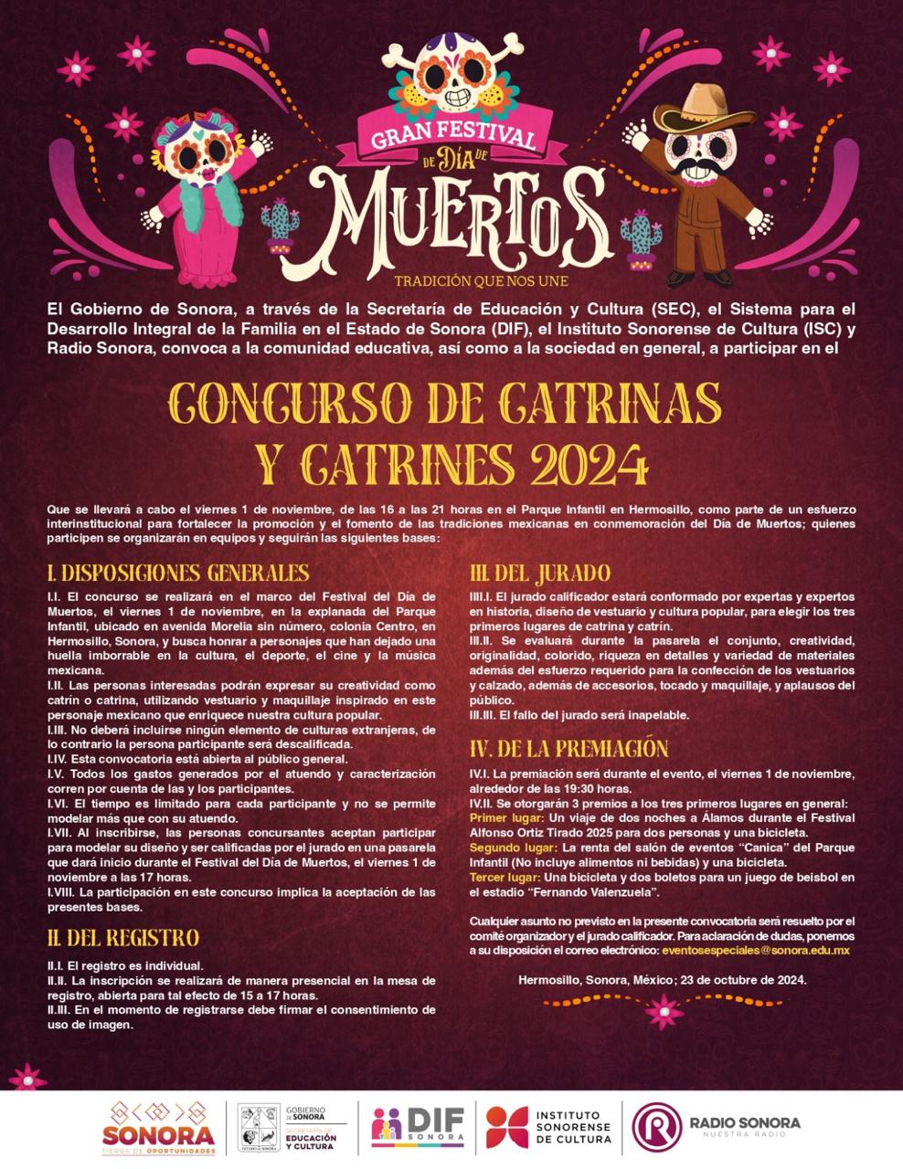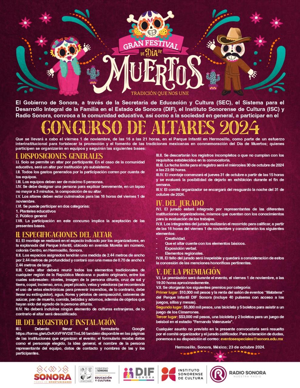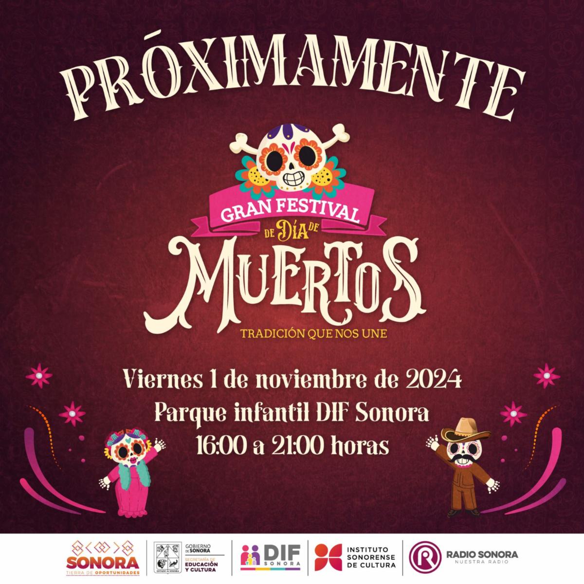 El Gobierno de Sonora, a través de la Secretaría de Educación y Cultura (SEC), el Sistema para el Desarrollo Integral de la Familia en el Estado de Sonora (DIF), el Instituto Sonorense de Cultura (ISC) y Radio Sonora invita a la comunidad en general a participar en el Gran Festival de Día de Muertos “Tradición que nos une”.