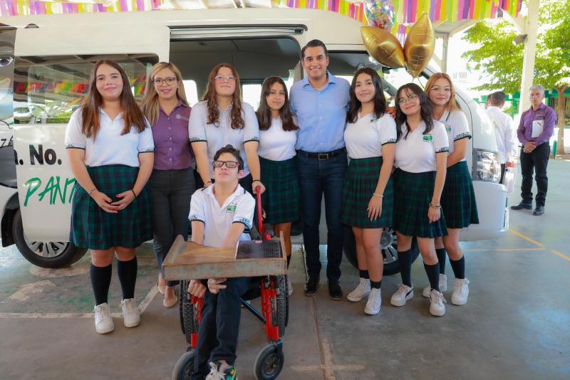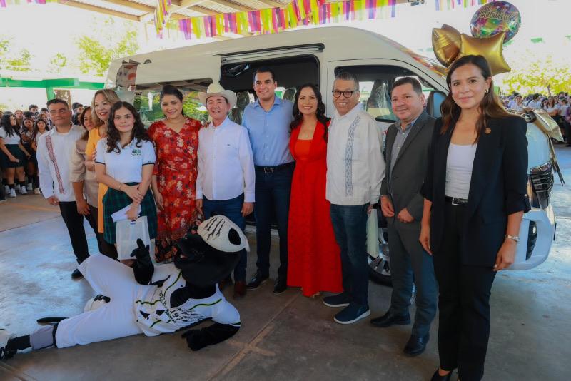 Gámez Gamboa entregó a la directora del plantel las llaves de una camioneta urban 2024, con capacidad para14 pasajeros, que fue donada por parte de los padres y madres de familia para que los estudiantes acudan a concursos académicos, artísticos, culturales y deportivos.