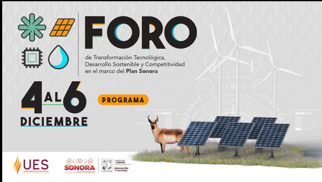 Para promover el Plan Sonora de Energía Sostenible, la Universidad Estatal de Sonora (UES), unidad Hermosillo, es sede del Foro de Transformación Tecnológica, Desarrollo Sostenible y Competitividad, que reúne a expertos en semiconductores, electromovilidad y desarrollo sustentable, lo que impulsará la investigación y conocimiento en un amplio programa de conferencias, ponencias y talleres que se llevará a cabo del 4 al 6 de diciembre.