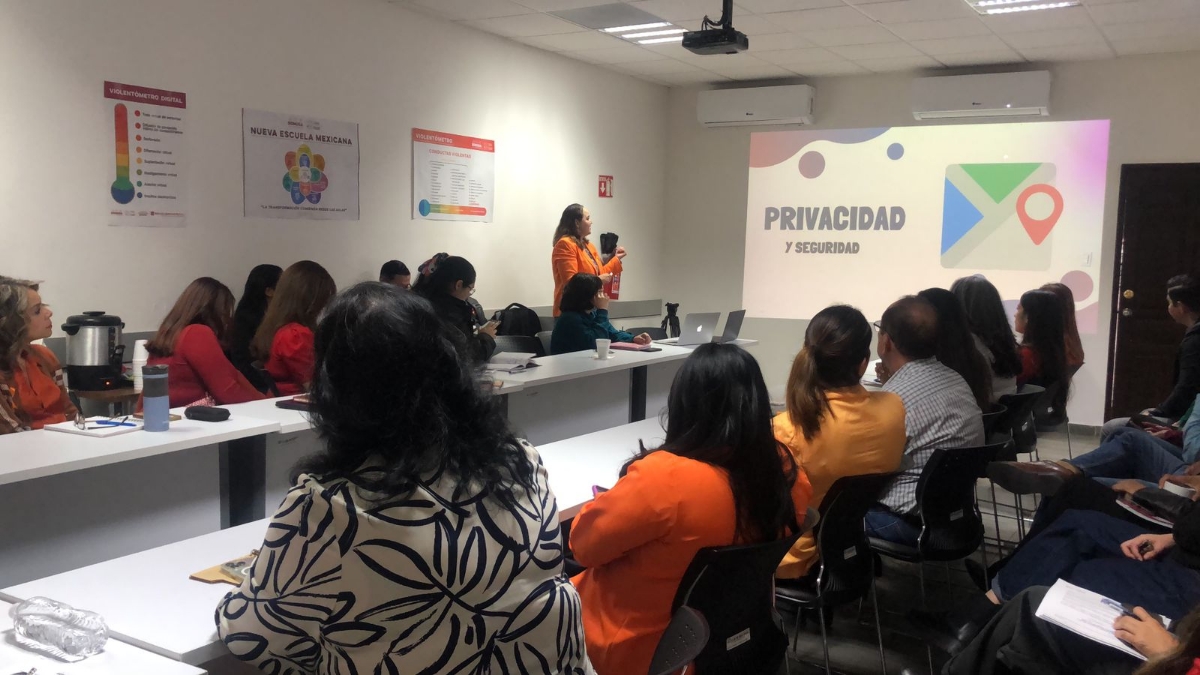 El taller fue impartido por María Elena Vega Amaya, docente en la Universidad Estatal de Sonora y colaboradora de Unesco México, quien implementó dinámicas prácticas para la identificación y manejo de situaciones de violencia digital en las escuelas.