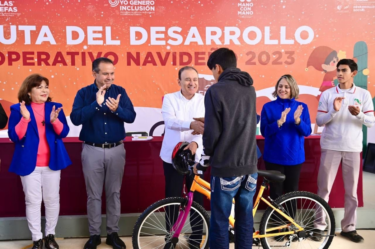 Para darle continuidad al programa de movilidad que llega a estudiantes, así como apoyar a familias en situación de vulnerabilidad, el gobernador Alfonso Durazo Montaño, entregó un total de 320 bicicletas con sus cascos protectores a jóvenes estudiantes de nivel media superior, así como 220 tarjetas tarjetas del programa Mano con Mano.
