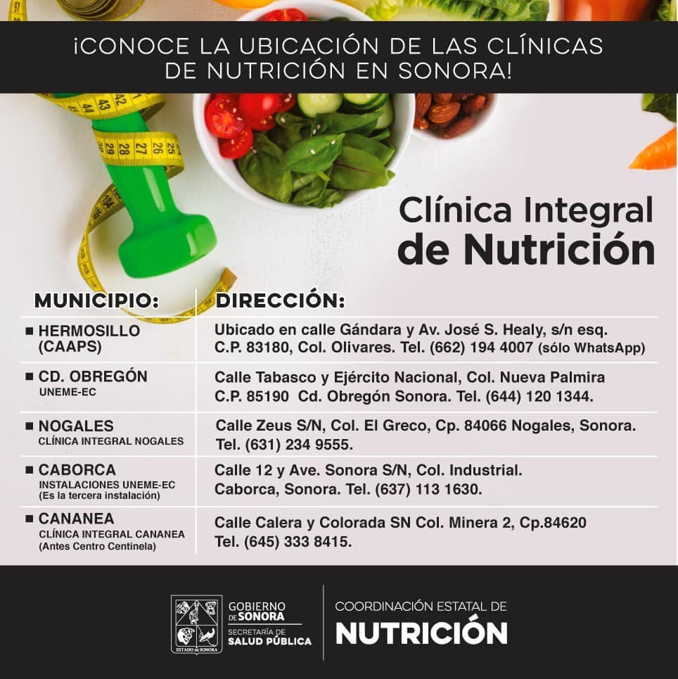 Para mantener un estilo de vida saludable, un buen peso de acuerdo a la edad y una dieta balanceada, la Secretaría de Salud (SSA) informó que en Sonora existen cinco clínicas integrales de nutrición para toda la población.