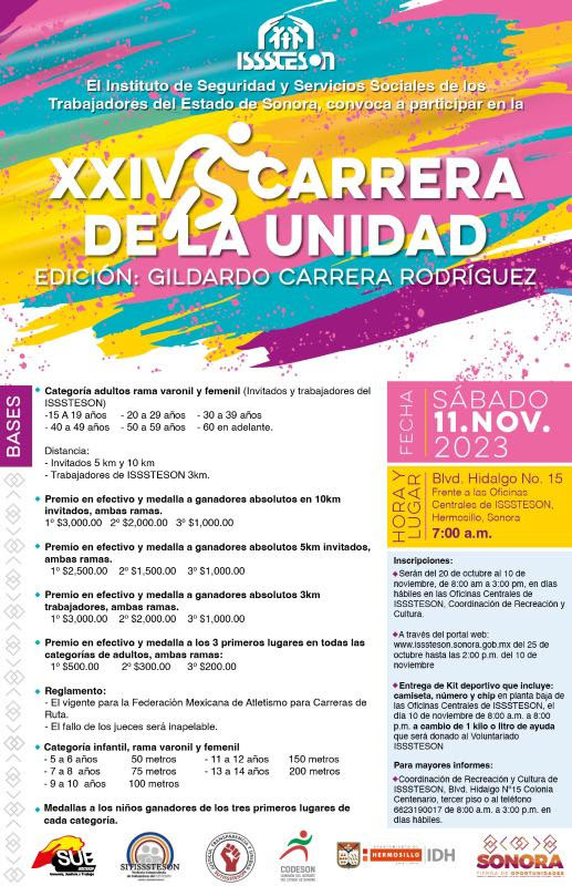 El próximo sábado 11 de noviembre se realizará la edición Vigésima Cuarta de la Carrera de la Unidad de Isssteson y las inscripciones aún se encuentran abiertas en línea a través del enlace https://www.isssteson.gob.mx/index.php/carreras o de manera presencial en las oficinas generales del Instituto en Hermosillo.