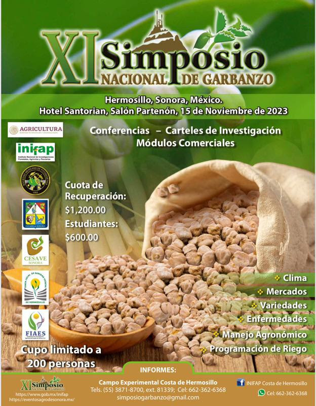 Para promover los paquetes tecnológicos para la máxima producción de cultivos de garbanzo, mercados, la cuestión climática, además de la liberación de nuevas variedades se realizará en Hermosillo el 11Vo Simposio de Garbanzo.